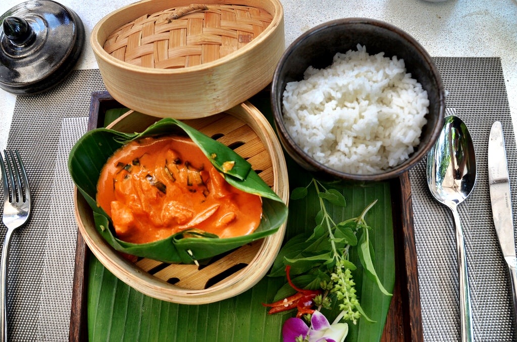 Traditional Khmer Chicken Amok and Steamed Jasmine Rice