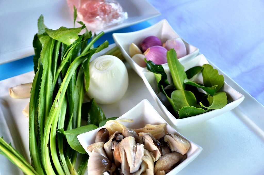 2. Bring stock to a boil in a large pot then add lemongrass, lime leaves, mushrooms, onion and limes. Cook for two minutes.