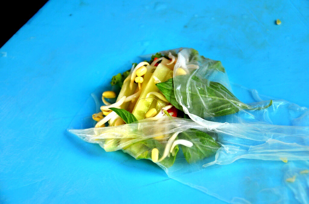 2. Arrange carrots, cucumbers, basil leaf and bean sprouts on the rice paper and gently roll
